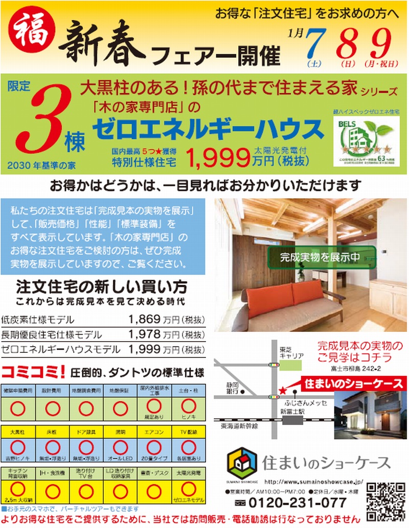 1月7日(土)〜9日(月)に、新春住宅フェアーを開催いたします。木の家専門店のゼロエネルギーハウスは限定3棟です。注文住宅をお考えの皆様限定で、特別フェアーのご案内も予定しております。完成見本の...